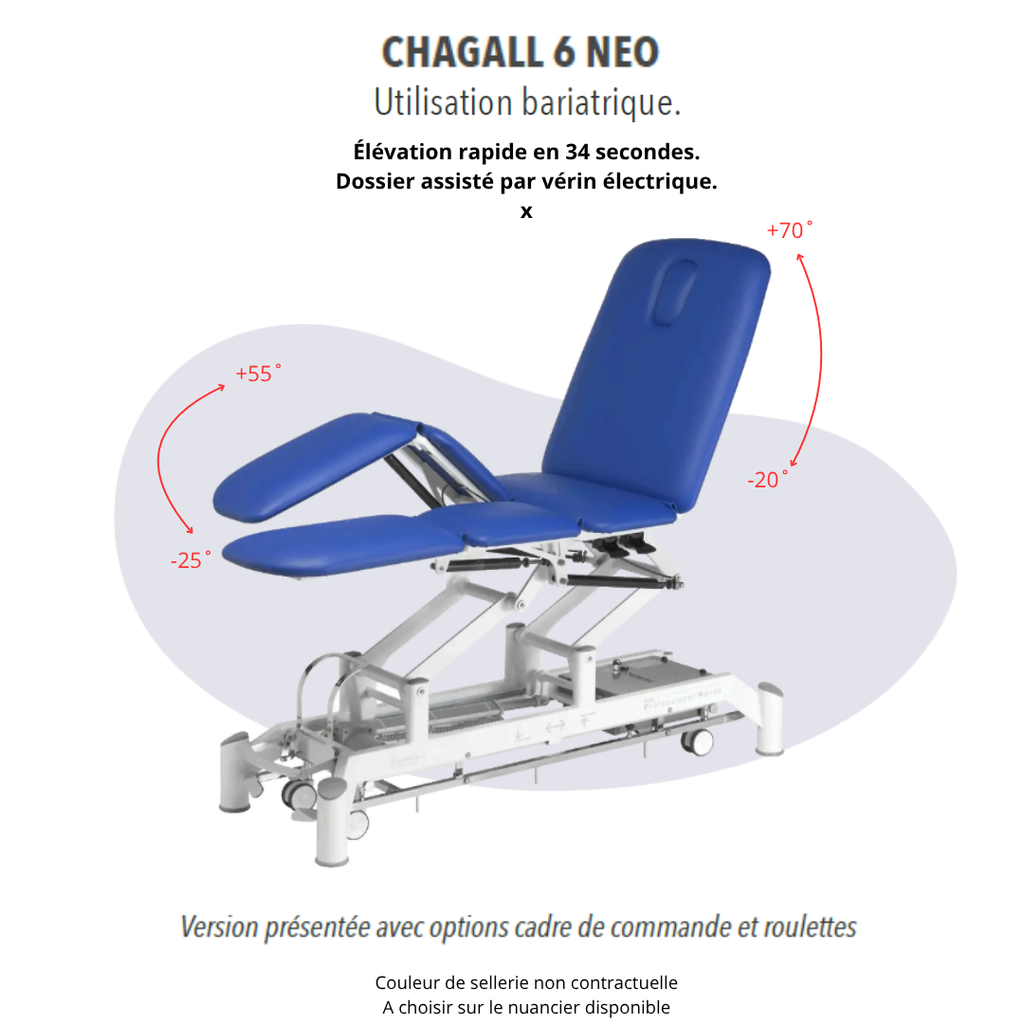 La Table de massage CHAGALL NEO 6 plans dispose de plusieurs fonctions. Cette table à hauteur variable est assistée par deux vérins électriques et quatre vérins à gaz. Elle assure sécurité et confort au patient tout en conférant une grande liberté d’action au professionnel pour examen médical, traitement, kinésithérapie et massages. Cette table permet une élévation rapide en 34 secondes. Elle possède un dossier assisté par vérin électrique.
