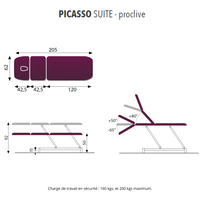 La table de massage Picasso Suite possède 3 plans, avec dossier et jambiers assistés par vérin à gaz. Cette table à hauteur variable assure sécurité et confort au patient tout en conférant une grande liberté d’action au professionnel pour thérapie, massages et soins médicaux. Elle confère une grande aisance de travail grâce à son dossier proclive jusqu’à 80° et sa têtière proclive.