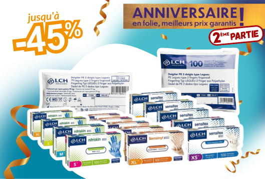 Gants latex, gants vinyle, gants nitrile, doigtiers… en promotion Anniversaire !
