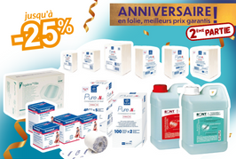 Compresses en non tissé, bandes adhésives élastiques, pansements, chlorhexidine, alcool isopropylique... en promotion Anniversaire !